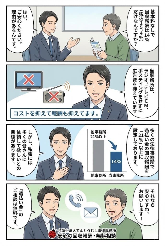 弁護士法人てんとうむし法律事務所では、テレビCMや電車の中吊り広告などの宣伝費を極力かけないため、過払い金回収報酬を「14%」(税込15.4%)に抑えております。
